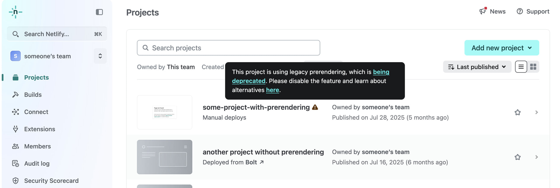 In your account’s Projects page, any project currently using the legacy prerendering feature will have a warning icon with a tooltip. This warning also appears in the overview page of any relevant project.