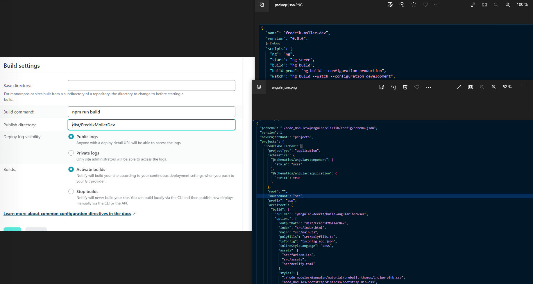 If you want Netlify to do the building, based on what I see in the repository, you would set the base directory to FredrikMollerDev, build command to npm run build and the publish directory to dist/FredrikMollerDev as this matches the outputPath set in the project’s angular.json.