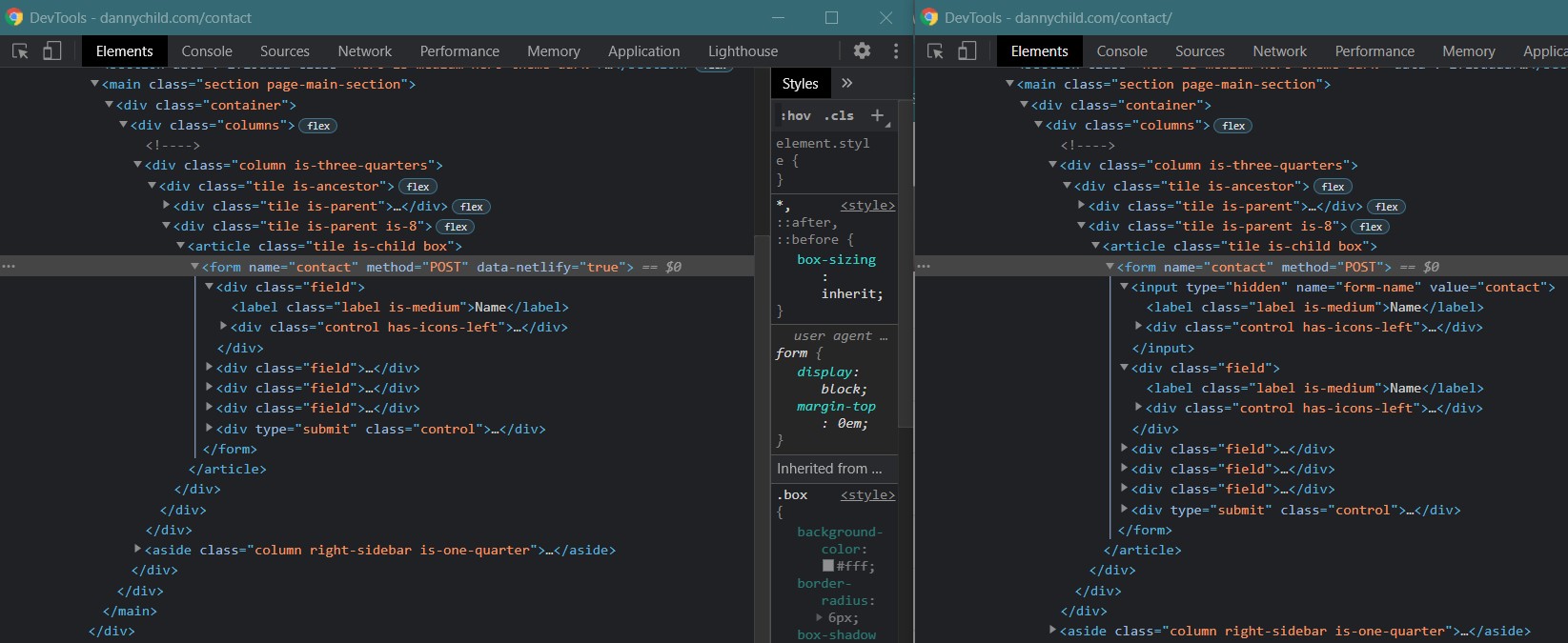 Notably in the body, the tag <data-netlify="true"> does not exist on the page with the trailing slash. Additionally, the input type field only exists with the trailing slash, as per the second screenshot. I was not able to identify any abnormalities in my repository, in comparison to the deployed template.